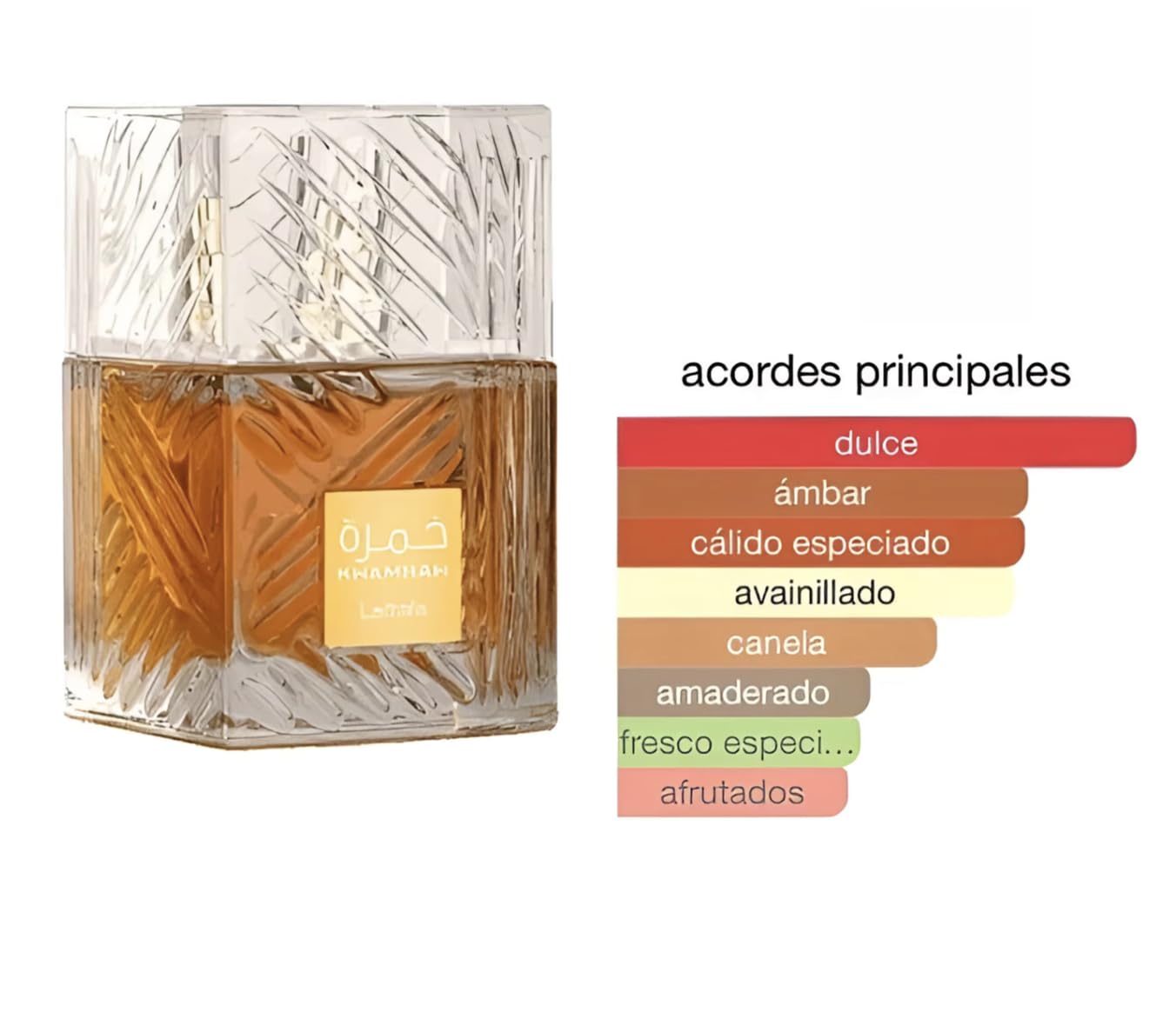 Lattafa Khamrah es una fragancia gourmand intensa y lujosa que combina especias cálidas, dátiles dulces y una base cremosa de vainilla y tonka. Opulenta, adictiva y extremadamente duradera, es perfecta para destacar con un aroma dulce y envolvente.