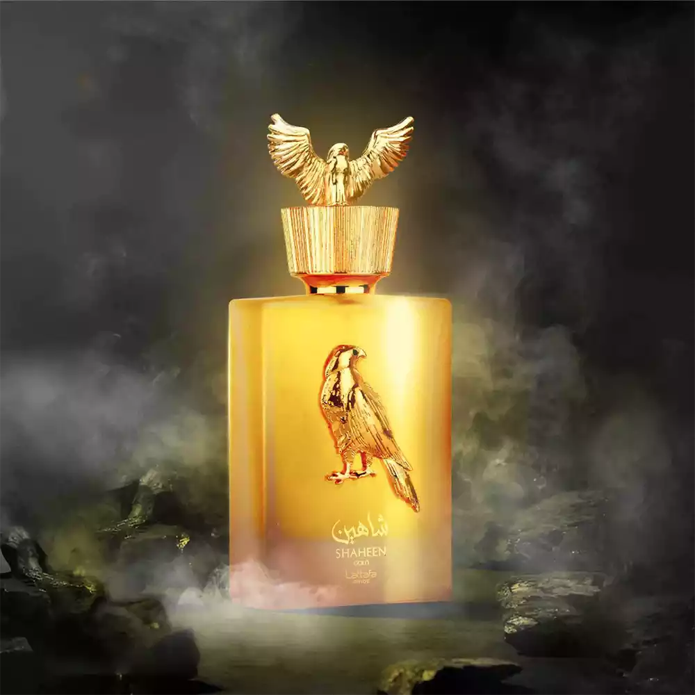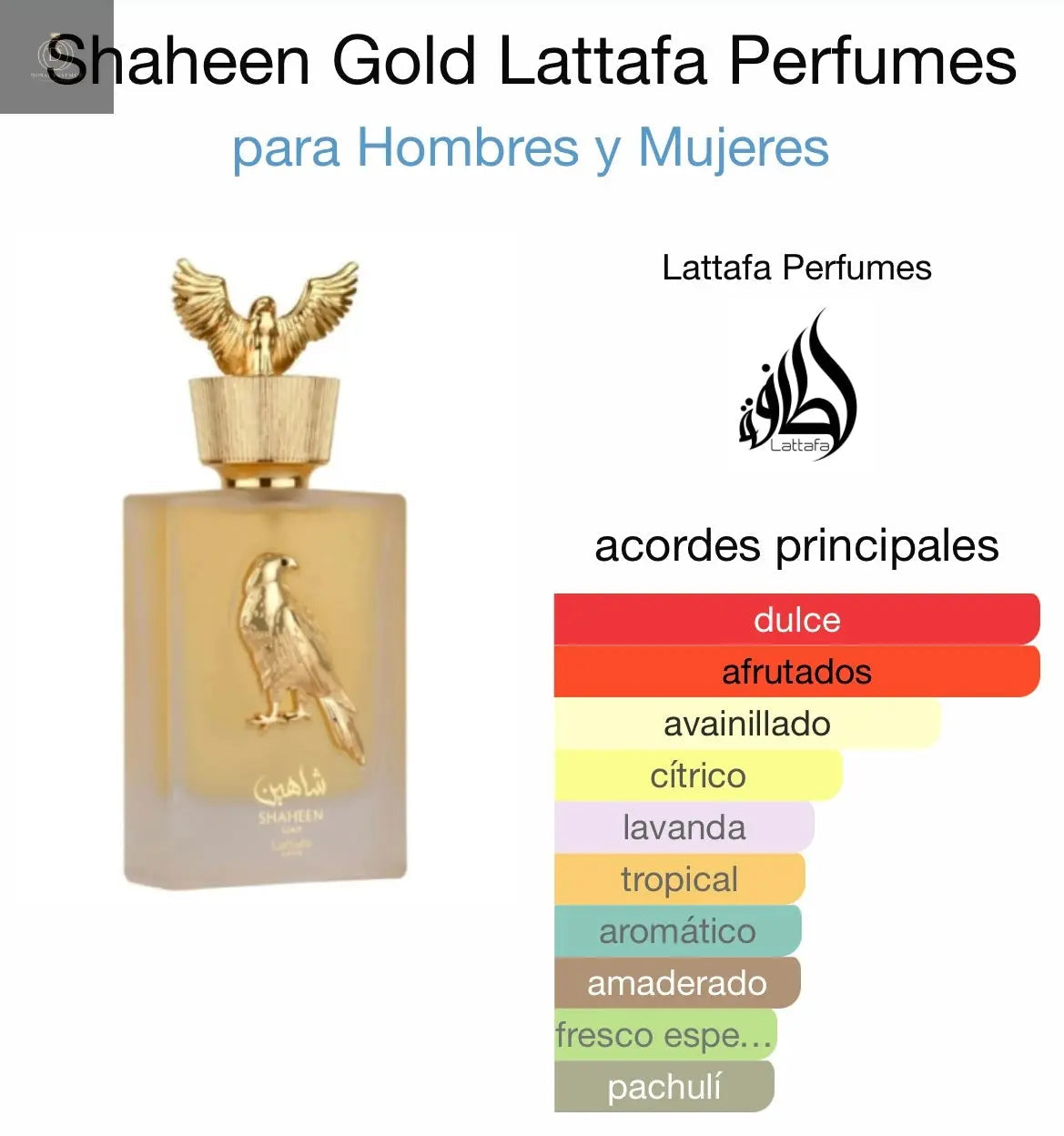 Shaheen Gold es una fragancia dulce y elegante que combina frutas luminosas, un corazón suave y una base cálida de vainilla y maderas. Refinada, versátil y atractiva, es perfecta para destacar con estilo y sofisticación en cualquier ocasión.